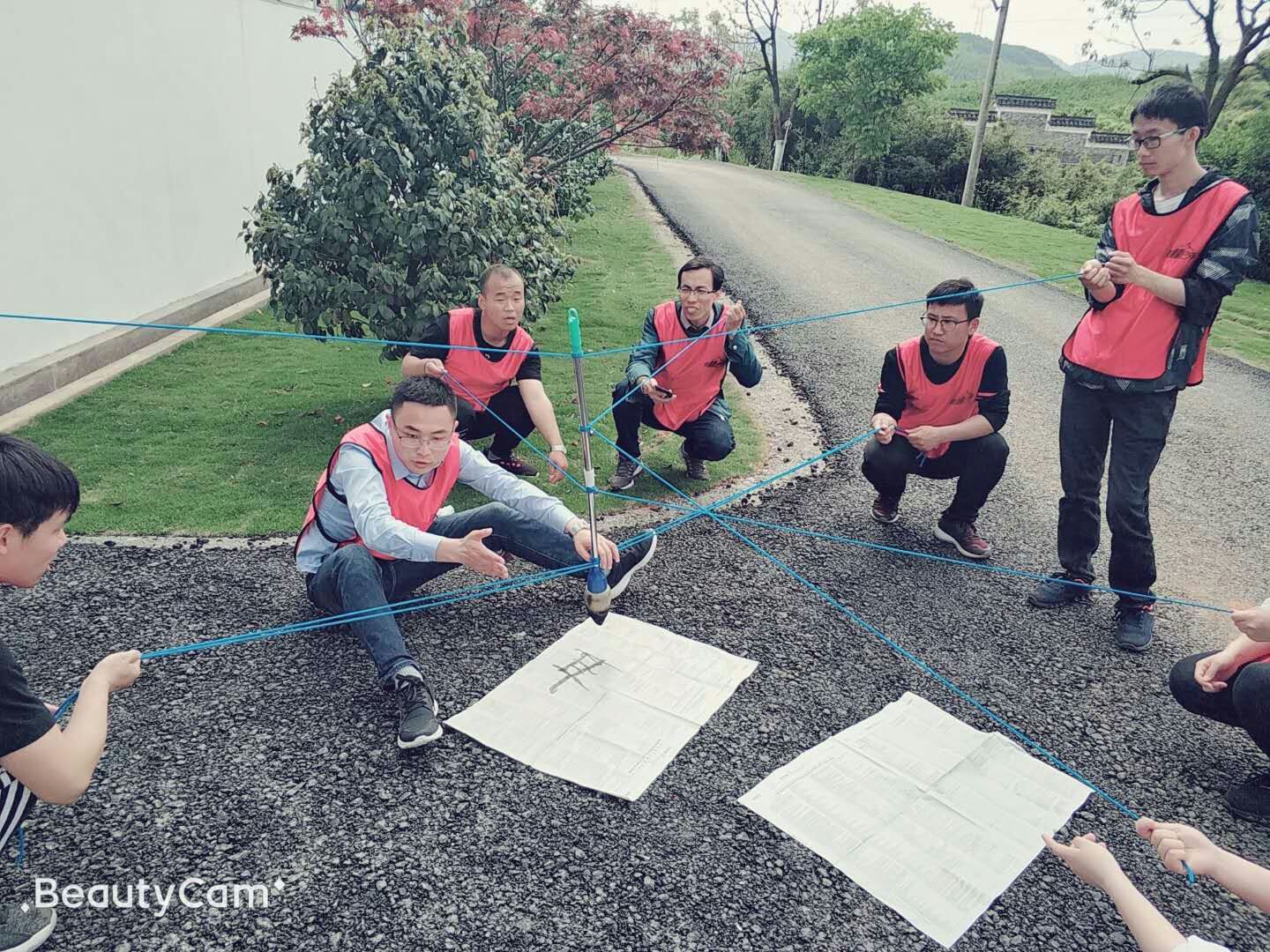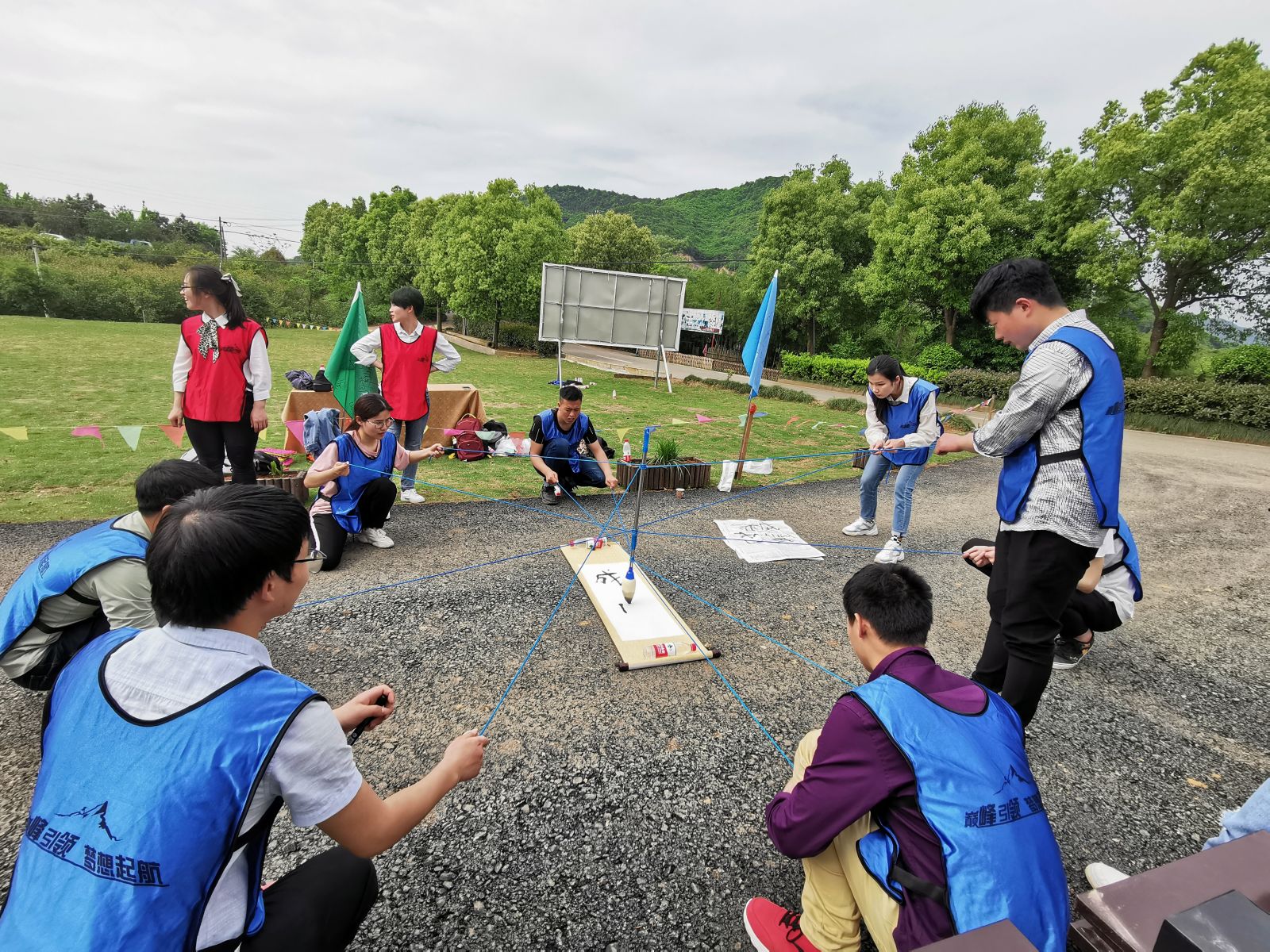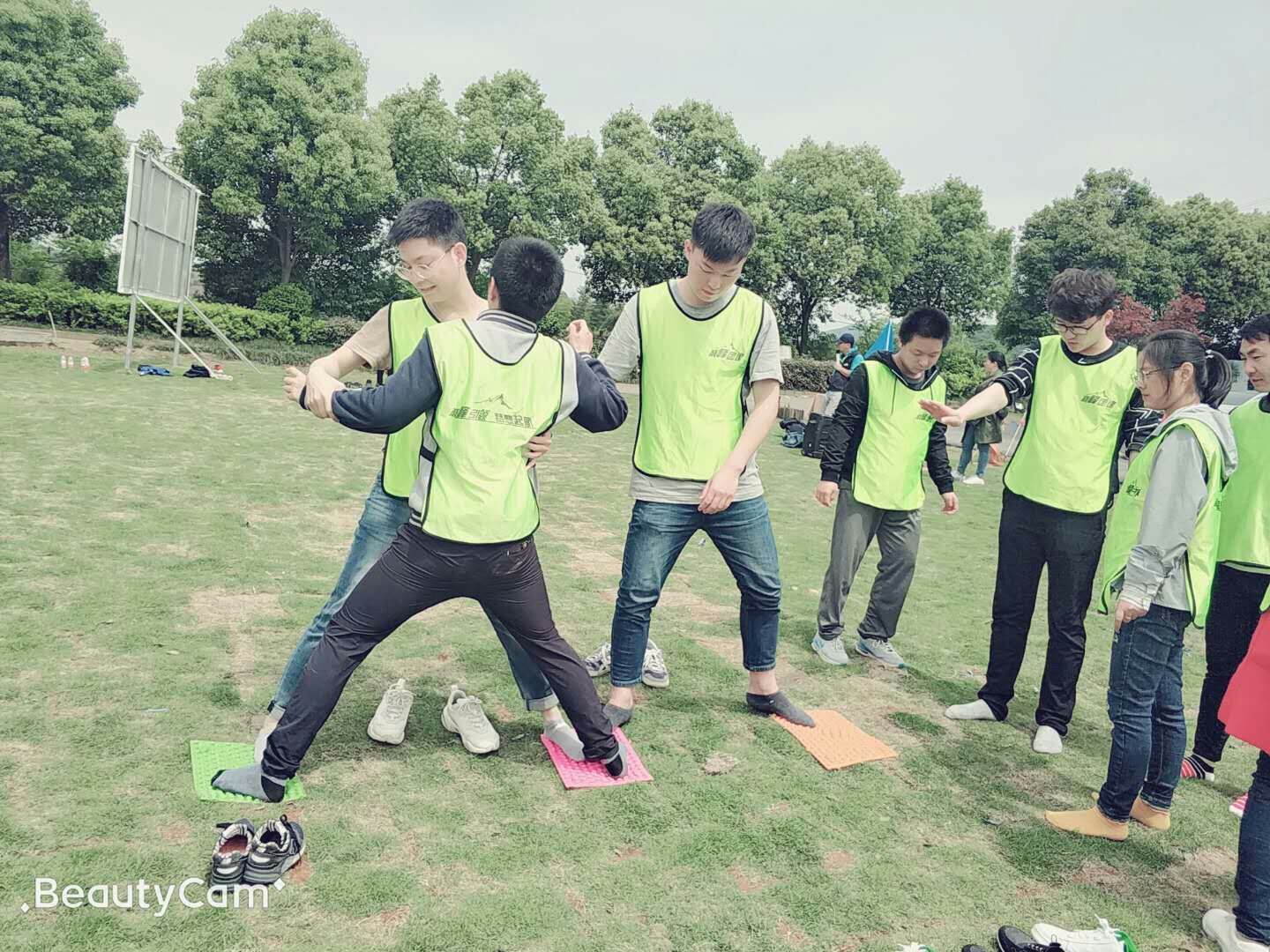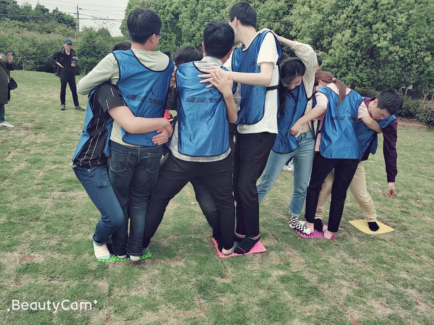 四块指压板,8.9个人过河,所有队员脚必须落在指压板上不能踩草地,违规就回起点重新开始,三支队伍没有一支队伍是一次性过河的,难度之大可想而知,好在大家锲而不舍,一次又一次的尝试,终于全员安全过河啦。