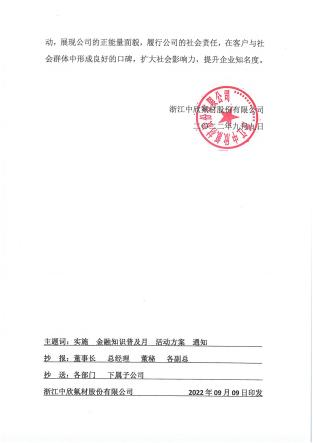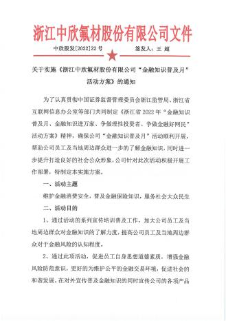 9月初,公司下发关于实施《浙江中欣氟材股份有限公司“金融知识普及月”活动方案》的通知(中欣股发[2022]22号),通过线上、线下方式对开展“金融知识普及月”宣传活动做了动员,公司行政部组织活动领导小组成员集中学习金融政策法规、反洗钱、反假币、征信、防范金融诈骗等有关知识,编制《防范网络及金融诈骗》等宣传折页,领导小组组长就开展“金融知识普及月”系列活动进行部署和安排,提出了活动的具体要求。通过学习动员,使领导小组成员深深地认识到开展此次活动是中欣氟材展现正能量面貌,扩大社会影响力,提升企业知名度,履行企业社会责任的重要举措。