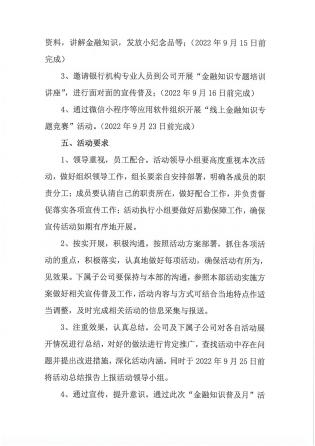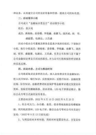 为了认真贯彻中国证券监督管理委员会浙江监管局、浙江省互联网信息办公室等部门共同制定《浙江省2022年“金融知识普及月、金融知识进万家、争做理性投资者、争做金融好网民”活动方案》精神,公司领导高度重视,9月初制定以“维护金融消费安全,普及金融保险知识,服务社会大众民生”为主题的公司“金融知识普及月”活动实施方案,成立活动领导小组,组织和发动党员及干部员工开展金融知识普及宣传等系列活动,现就活动开展情况总结如下: