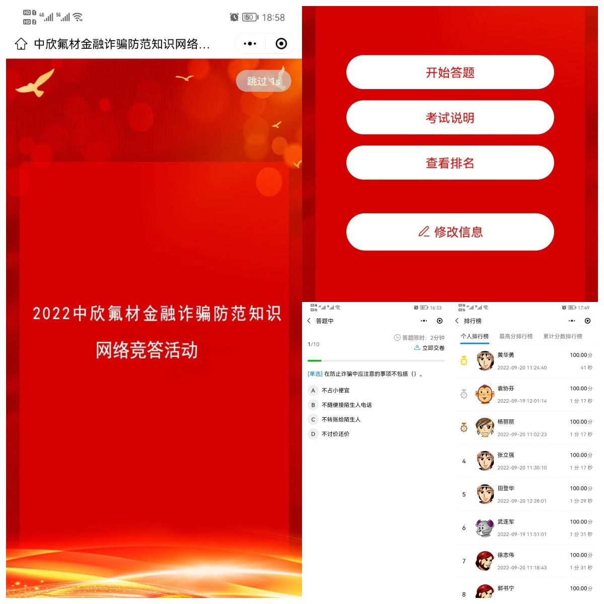 为了让更多的员工通过不同方式参与到本次金融知识普及月活动,进一步提升全员识假防骗能力,有效防范电信网络诈骗风险,公司活动领导小组在公司员工餐厅组织开展了金融诈骗防范知识网络竞答活动。本次答题竞赛通过微信现场扫码答题的形式进行;扫一扫小程序后进入授权,授权完成后点击开始答题,采用实名制请输入自己姓名和部门/车间,保存之后开始答题,随机抽取10题,限时3分钟,答完全部题目后提交,此时会显示你的分数,如果显示您是满分,可免费领取小礼品。通过线上答题,让员工提高辨别判断真假意识,加深对网络金融诈骗的认识,树立正确的法治意识和消费观念,维护自身的人身安全、财产安全。同时也请各位员工将学到的知识带到各自家庭作进一步宣传,让家人们都能提高识别和防范网络电信诈骗的能力。